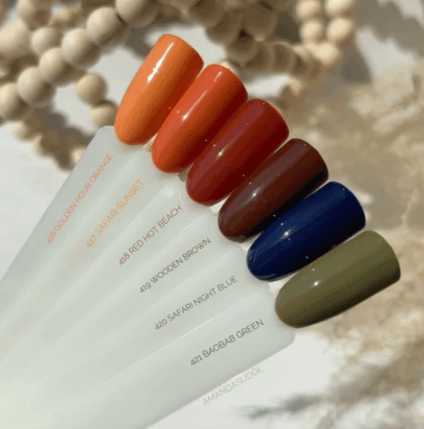 | Colores | 416 Golden Hour Orange, 417 Safari Sunset, 418 Red Hot Beach, 419 Wooden Brown, 420 Safari Night Blue, 421 Baobab Green |