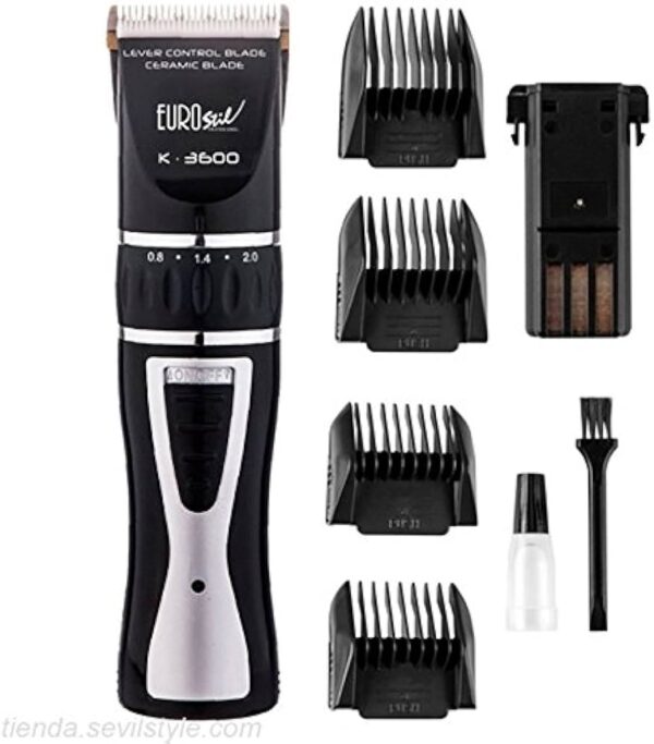Incluye: 4 peines (3mm. 6mm. 9mm. y 12mm.) además de aceite lubricante, cepillo para limpiar la maquina y peines, adaptador.